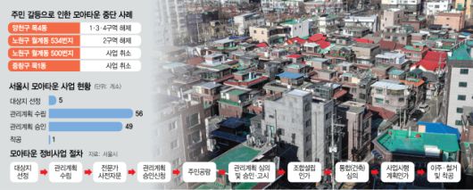깜깜이 공사 분담금과 이주 부담 등으로 주민 간 대립이 격화하며 서울시 모아타운 사업 구역 곳곳이 몸살을 앓고 있다. 조합 설립이 진행되지 못하고 관리계획 수립 및 승인 단계에 멈춰 있는 곳이 많아 2021년 처음 모아타운 사업이 시작된 이후 4년이 지나도록 사업지 111곳 중 착공에 성공한 곳은 단 1곳에 불과하다.