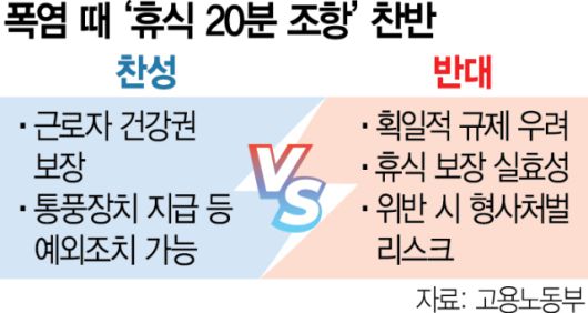33도 이상 폭염 시 작업을 할 때 2시간 이내 20분 이상 근로자를 휴식하도록 한 정부 방침에 제동이 걸렸다. 이처럼 일률적인 규제는 모든 사업장이 준수하기 어렵고 근로자의 건강권을 제대로 보호할 수 있을지도 의문이라는 지적이 나왔기 때문이다. 하지만 노동계는 기존 방침 유지를 원하고 있어 정부의 대안 마련까지 진통이 예상된다.