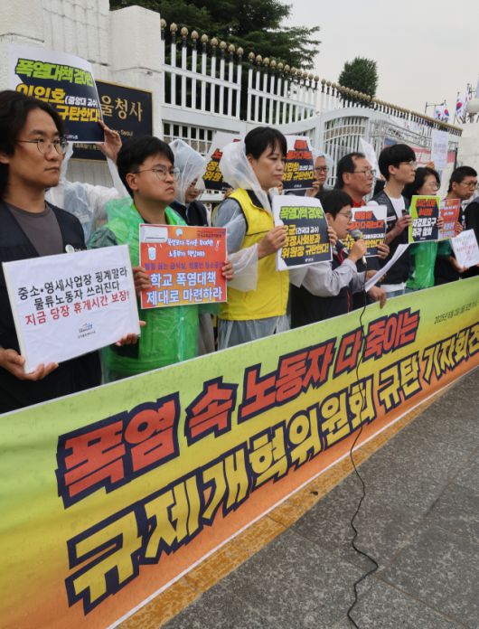 고용부는 그러나 ‘20분 이상 휴식 조항’을 바꾸기도 쉽지 않은 딜레마에 빠져 있다. 노동계의 반발이 거세기 때문이다. 민주노총은 이날 정부서울청사 앞에서 기자회견을 열고 규개위에 “재검토 요구를 철회하라”고 촉구했다. 민주노총은 “(조항은) 폭염으로부터 노동자의 생명과 건강을 보호하기 위한 최소한의 조치”라며 “법은 시행됐지만, 구체적인 조치가 없는 혼란이 벌어졌다”고 비판했다.