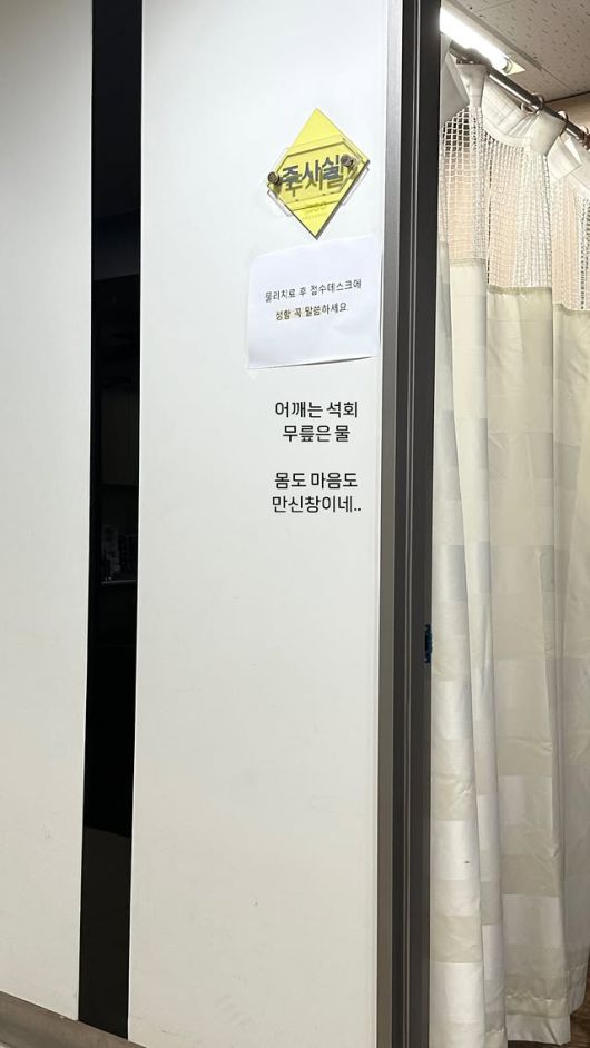 이루는 2일 개인 계정에 "어깨는 석회, 무릎은 물, 몸도 마음도 만신창이네"라는 글과 함께 병원에서 치료를 받은 사진을 공개했다.