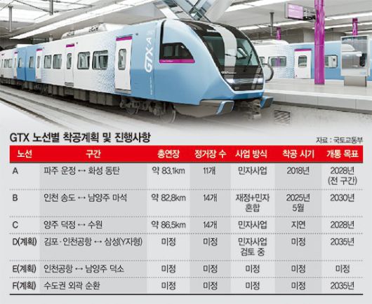 GTX 기대를 키우는 또 다른 배경은 정치권의 움직임이다. 이재명 대선 후보가 A·B·C 외에도 D·E·F 노선을 추진하겠다는 구상을 내놓은 이후 "우리 동네도 GTX에 포함되지 않을까" 하는 기대도 덩달아 확산되는 상황이다. 국민의힘 김문수 후보도 GTX A·B·C 노선을 임기 내 개통하고, D·E·F 노선은 임기 내 착공하겠다는 공약을 발표하며 기대감을 부풀렸다. 부동산 업계 관계자는 "GTX는 수도권 생활권 구조를 바꾸는 교통망으로 인식된다"며 "공사 진행 여부 및 진척의 정도에 따라 시장의 희비가 엇갈릴 수밖에 없다"고 말했다.