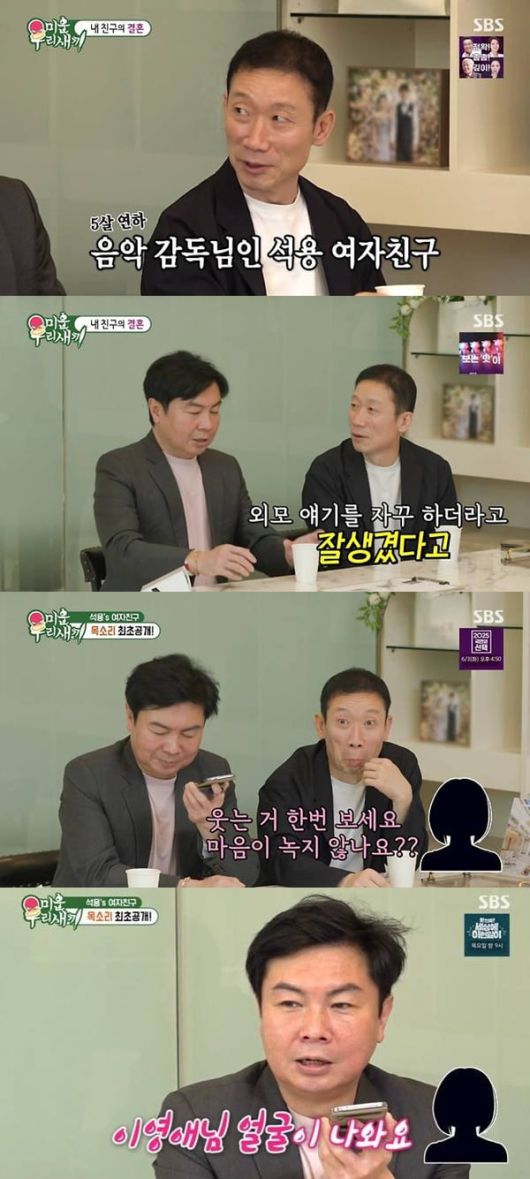 이후 정석용 여자친구와 통화가 성사됐다. 정석용 여자친구는 어떤 점이 좋냐는 말에 "웃는 거 한번 보세요. 마음이 녹지 않냐"며 "갓 세수한 얼굴 보면 깜짝 놀란다. 백옥이 따로 없다. 이영애 얼굴이 나온다"고 자랑했다.