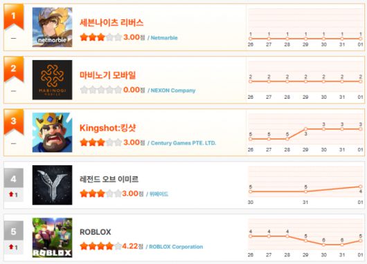 ‘킹샷’은 저력을 발휘하며 5위에서 3위로 껑충 뛰어오르며 다시 한 번 존재감을 입증했다. ‘로블록스’는 다소 하락했지만 Top 5 자리를 지키며 체면을 유지했다.