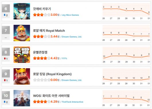 이밖에 중위권에서는 ‘로얄매치’가 한 계단 내려간 7위를 기록했고, 지난주 오랜만에 복귀했던 ‘운빨존많겜’은 이번 주엔 8위까지 상승하며 팬들의 뜨거운 관심을 입증했다. 로얄매치와 같은 개발사의 작품인 ‘로얄킹덤’은 9위를 지키며 안정적인 흐름을 보였고, ‘WOS: 화이트 아웃 서바이벌’은 최근 가장 낮은 순위인 10위로 떨어지며 아쉬움을 남겼다.