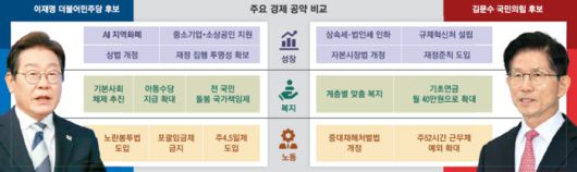 하지만 복지 분야 공약에서 이 후보는 ‘보편 복지’, 김 후보는 ‘맞춤형 복지’로 정반대 방향을 향했다. 노동 분야 공약에서도 이 후보와 김 후보는 각각 ‘노동자 권리 강화’와 ‘기업 경쟁력 제고’라는 상반된 지향점을 표출했다.