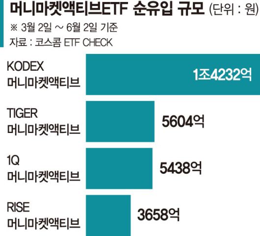 미국의 관세 정책 불확실성이 장기화하면서 단기 안정 수익을 추구하는 파킹형 상장지수펀드(ETF) 상품에 자금이 몰리고 있다. 2일 코스콤 ETF CHECK에 따르면 최근 3개월(3월 2일~6월 2일) 동안 자금이 가장 많이 유입된 종목은 'KODEX 머니마켓액티브'로 1조4232억원이 순유입됐다. 같은 기간 머니마켓액티브 관련 종목 4개가 자금유입 상위 10개 종목에 이름을 올렸다. KODEX 머니마켓액티브(1위)를 포함해 'TIGER 머니마켓액티브'(3위)에 5604억원, '1Q 머니마켓액티브'(5위)에 5438억원, 'RISE 머니마켓액티브'(10위)에 3658억원이 순유입된 것으로 집계됐다.