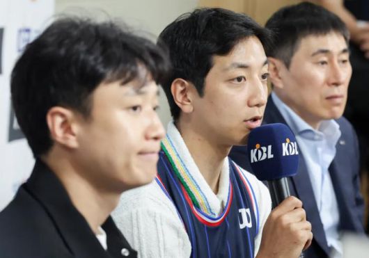 부산 KCC로 이적한 허훈(가운데)이 29일 서울 KBL센터에서 열린 입단식에 형 허웅(왼쪽), 이상민 KCC 감독과 함께 참석해 취재진 질문에 답하고 있다. 연합뉴스 |