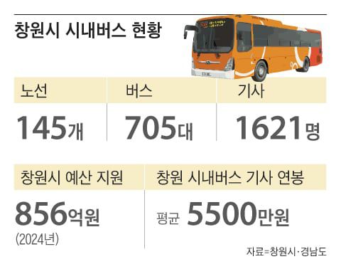 창원에는 시내버스 705대가 운행 중이다. 기사는 1620여 명, 이들의 평균 연봉은 5500만원이다. 창원시가 예산을 들여 버스 회사의 적자를 보전해주는 준공영제 방식으로 운영한다. 창원시는 지난해 버스 회사에 856억원을 지원했다.