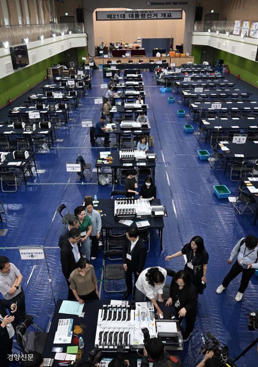 개표 설비 준비 제21대 대통령 선거를 하루 앞둔 2일 서울 용산구 신광여자고등학교에 마련된 개표소에서 선거관리위원회 직원들이 개표 설비를 준비하고 있다. 서성일 선임기자 centing@kyunghyang.com |