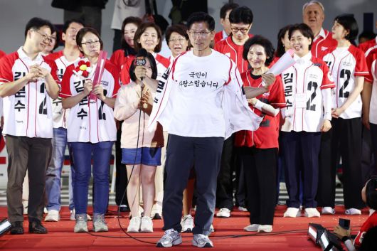 김문수 국민의힘 대통령 후보가 제21대 대통령 선거를 하루 앞둔 2일 오후 서울 중구 서울시청 앞 광장에서 열린 ‘울려라 함성, 들어라 승리의 메아리’ 피날레 유세에서 ‘국민이 자랑스럽습니다’라고 적힌 티셔츠를 보여주고 있다. 2025.6.2 (서울=뉴스1) |
