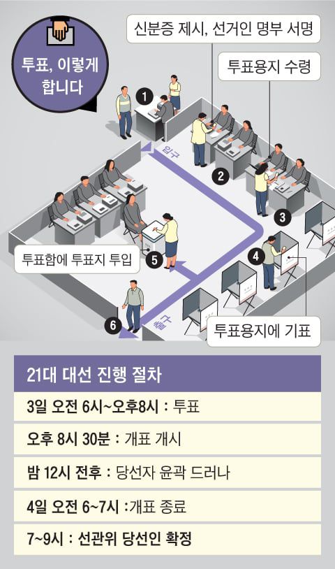 제21대 대통령 선거 본투표는 3일 오전 6시부터 전국 1만4295개 투표소에서 일제히 실시된다. 투표가 끝나는 공식 시각은 오후 8시이며, 종료 시각 전까지 투표소에 도착해 줄을 선 유권자는 투표할 수 있다. 통상 대선 투표 종료 시각은 오후 6시이지만 이번 대선은 윤석열 전 대통령 파면으로 인한 보궐선거로 열리기 때문에 선거법에 따라 두 시간이 늘어난 오후 8시로 바뀌었다.