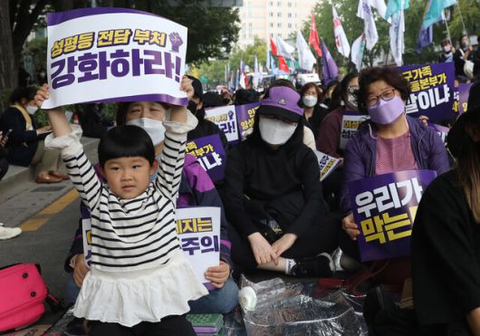지난 2022년 10월15일 오후 서울 종각역 앞에서 전국 195개 여성·노동·시민사회 단체 회원들이 정부의 여성가족부 폐지안을 규탄하는 집중집회를 하고 있다. 윤운식 선임기자 yws@hani.co.kr