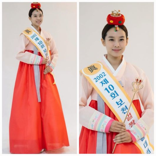 붉은 치마와 옅은 분홍 저고리, 머리 위에는 전통 족두리를 단단히 얹은 모습. 가슴엔 ‘2002 제10회 보천 선발대회 진’이라 쓰인 리본이 걸려 있어, 마치 23년 전 미인대회를 연상케 하는 단정한 자태가 눈길을 끌었다.