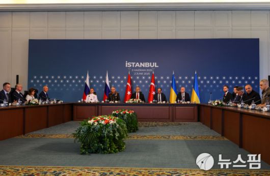 [이스탄불 로이터=뉴스핌] 장일현 특파원 = 2일(현지시간) 튀르키예 이스탄불 시라간 궁전에서 우크라이나와 러시아 협상 대표단이 다시 만났다. 지난달 16일에 이어 두 번째 만남이다. 오른쪽이 우크라이나 대표단이고 왼쪽이 러시아 대표단이다. 가운데는 중재를 맡고 있는 튀르키예 정부 대표들이다. 2025.06.02. ihjang67@newspim.com |
