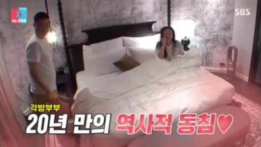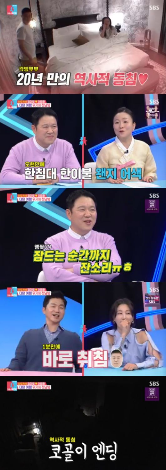 그리고 이들은 야시장 투어를 마치고 호텔로 왔다. 두 사람의 생애 첫 호텔에서 이들은 20년만에 동침을 하게 됐다. 남편의 코골이 때문에 각자 잠을 잤다는 김미령은 "오랫동안 같이 안 자면 되게 어색하다"고 했다.