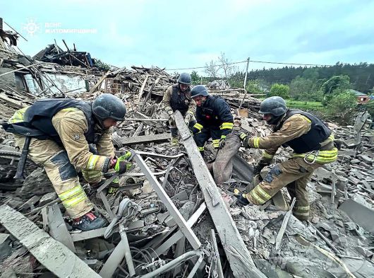 25일(현지시간) 우크라이나 지토미르에서 러시아 군의 공습을 받아 쑥대밭이 된 주택가서 구조대원이 수색을 하고 있다. 2025.05.26 ⓒ AFP=뉴스1 ⓒ News1 우동명 기자 |