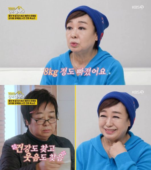 혜은이는 “헬스를 등록한 지 1년 됐다. 8kg 정도 빠졌다. 77에서 66이 됐다”며 미소 지었다.