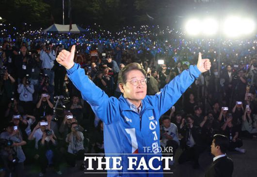 이재명 더불어민주당 대선 후보가 대선을 하루 앞둔 2일 서울 여의도공원 문화의마당에서 열린 마지막 유세에서 엄지손가락을 들어 '기호 1번'을 표시하며 지지를 호소하고 있다. /배정한 기자 |