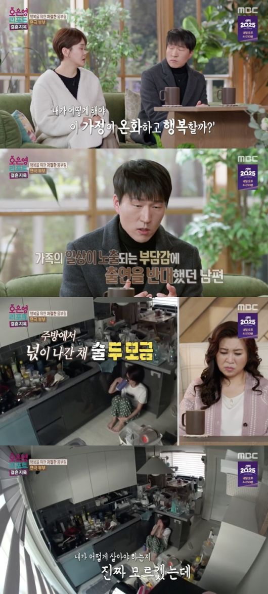 일상 속 아내는 식사도 거른 채 누워 있다가 술을 마신 후 눈물을 흘렸다. 아내는 “내가 어떻게 살아야 하는지 진짜 모르겠다. 아무도 안 알려준다”라고 말했다. 남편은 “아내가 2022년 3월부터 병원에 다닌 것 같다. 우울증, 성인 ADHD (판정을) 받았다. 당시에 제가 최대한 (아내) 옆에 있어 줬다고 생각하는데 아내 입장에서는 그렇게 생각이 안 들 수도 있겠다는 생각을 한다. 그렇게 만든 데 제가 일조를 한 것이다”라며 아내의 우울증이 자신 때문이라고 말했다.