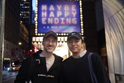 지난해 11월 '어쩌면 해피엔딩' 프리뷰 공연이 진행 중이던 미국 뉴욕 브로드웨이 벨라스코 극장 앞에서 만난 박천휴, 윌 애런슨. '윌 휴 콤비'로 불리는 두 사람은 지난해 제18회 차범석희곡상 뮤지컬 대본 부문 수상작 '일 테노레'의 이야기와 음악도 함께 만들었다. /뉴욕=이태훈 기자