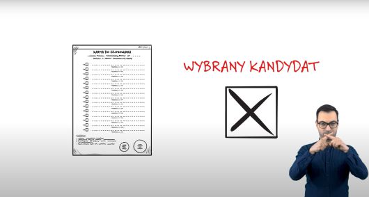 폴란드 선거관리위원회의 투표 방법 교육 영상 한 장면. 선관위 관계자가 지지하는 후보 이름 옆에 있는 기표칸에 'X' 표시를 하라고 설명하고 있다. 'WYBRANY KANDYDAT'는 '선택하는 후보'라는 뜻./폴란드 선거관리위원회 |