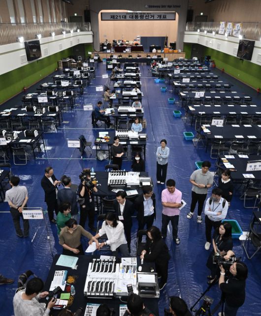 제21대 대통령선거 투표일을 하루 앞둔 2일 오후 서울시 선거관리위원회 관계자들이 서울 용산구 신광여자고등학교 개표소에서 투표지분류기의 최종 모의시험을 진행하고 있다. 전민규 기자 |