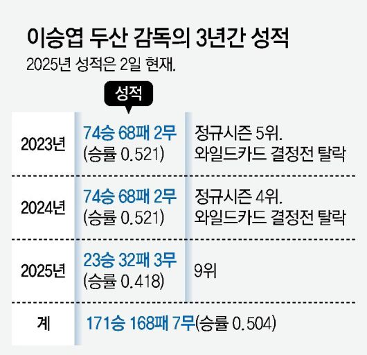 이 감독은 세 시즌 통산 171승 168패 7무(승률 0.504)의 기록을 남긴 채 두산과의 인연을 마무리했다. 포스트시즌에서는 1승도 수확하지 못했다.