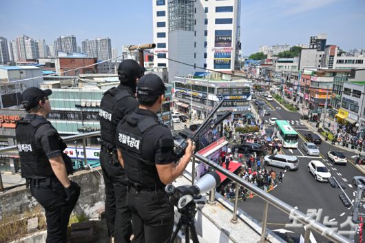 26일 경기 안성시 안성중앙시장 서인사거리에서 열린 김문수 국민의힘 대선후보 유세에 경찰 특공대가 경계 근무를 하고 있다. 안성=황진환 기자 |