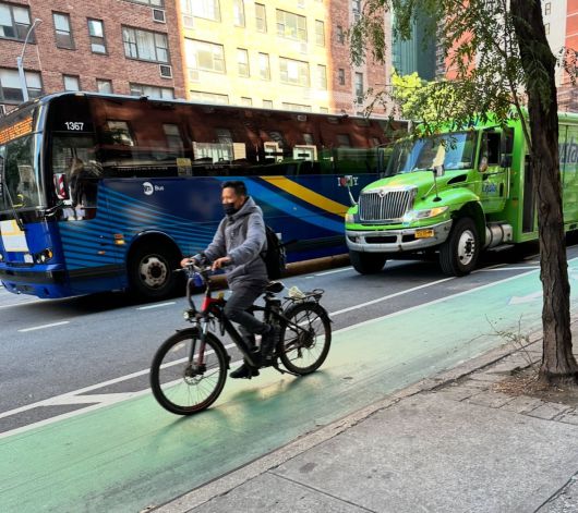 미국 뉴욕 맨해튼에서 전기 자전거가 도로를 달리는 모습./윤주헌 특파원 |