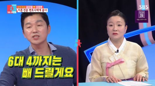 박민철 변호사는 "가게를 일궈오면서 경제적인 부를 이룬 게 부부가 함께 했기 때문이다"라며 "거의 5대 5일 가능성이 굉장히 높다"라고 말했다. 이에 김미령은 "그럼 그냥 살아야겠다"라고 말했다.