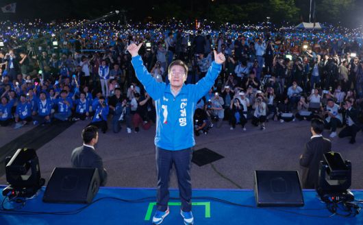 이재명 더불어민주당 대선 후보가 선거를 하루 앞둔 2일 서울 여의도공원 마지막 유세에서 연설을 마친 뒤 시민들에게 인사하고 있다. 연합뉴스 |