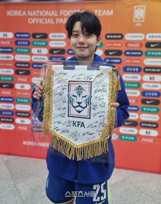 전유경이 2일 콜롬비아전을 마친 뒤 동료들의 사인이 담긴 기념품을 들고 포즈를 취하고 있다. 사진 | 용인=박준범기자 |
