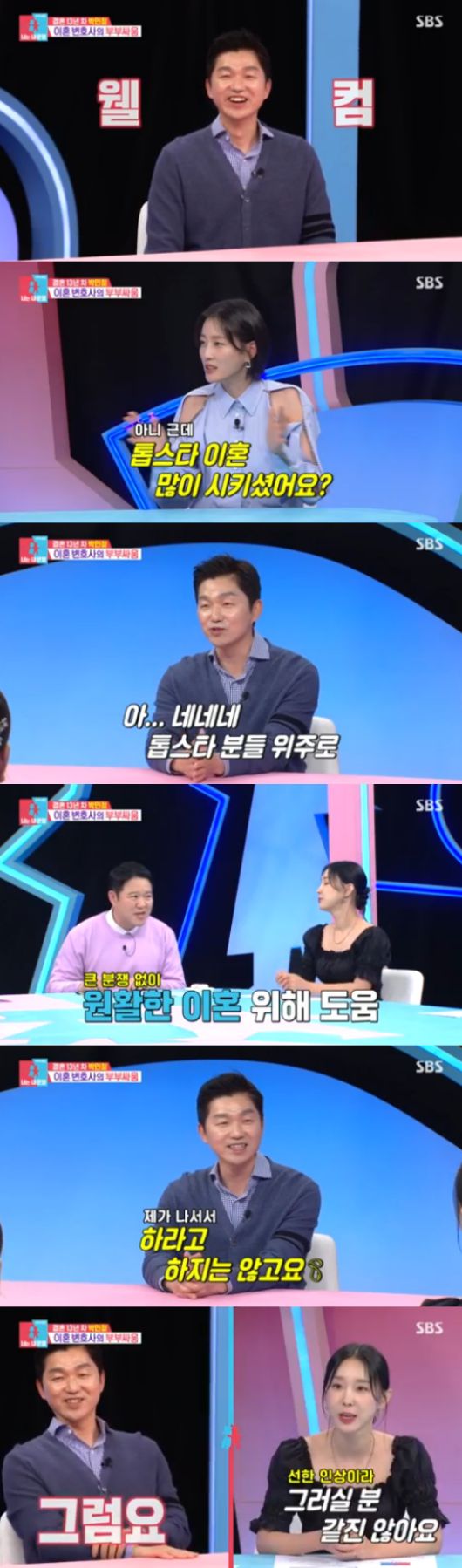 박민철은 "톱스타 부부들 위주로"라고 했고, 김구라는 "이혼을 시킨세 아니라 원활한 이혼을 위해 도움을 준 것"이라고 했다. 이에 박민철은 "제가 나서서 이혼을 하라고 한 건 아니었다"고 말해 웃음을 줬다.