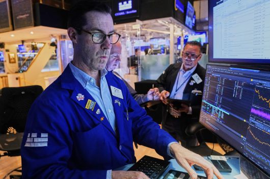 미국 뉴욕증권거래소(NYSE)에서 트레이더가 주가를 살피고 있다. 뉴욕/AP연합뉴스 |