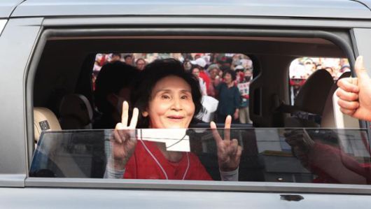 김문수 국민의힘 대선 후보 배우자인 설난영 여사가 5월 31일 서울 동작구 중앙대병원 광장에서 열린 집중 유세에 참석한 뒤 차량을 타고 이석하며 손가락으로 기호 2번을 만들어 보이고 있다. 뉴시스 |