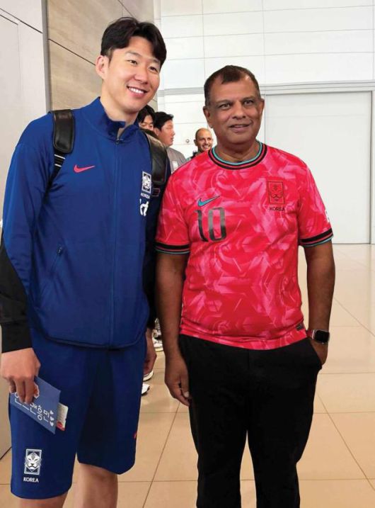 2일 토니 페르난데스 캐피털 A 및 에어아시아 그룹 회장이 방한해 이라크로 출국하는 한국 축구 국가대표팀을 응원했다. 사진 왼쪽부터 인천국제공항에서 기념 사진을 촬영하는 손흥민, 토니 페르난데스 회장. [사진=에어아시아] |