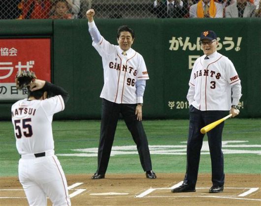 지난 2013년 나가시마 시게오 요미우리 자이언츠 종신 명예감독이 일본 도쿄돔에서 아베 신조 당시 총리와 함께 시구 행사에 참석하고 있다. 지지통신 연합뉴스 |