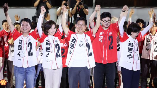 ▲ 2일 피날레 유세에서 지지를 호소하고 있는 국민의힘 김문수 대선 후보. 왼쪽부터 안철수 의원, 나경원 의원, 김 후보, 한동훈 전 대표, 양향자 전 의원.