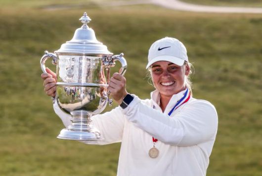 2일 미국여자프로골프(LPGA) 투어 시즌 두 번째 메이저대회인 제80회 US여자오픈 정상에 선 마야 스타르크가 우승 트로피를 들어 올리며 미소 짓고 있다. [연합뉴스·로이터] |