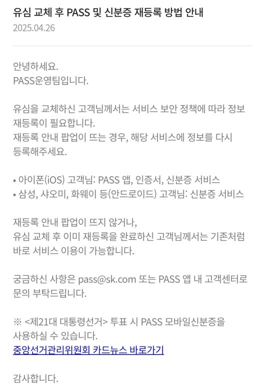 SKT 유심 교체한 PASS앱 고객, 투표시 모바일신분증 재등록해야