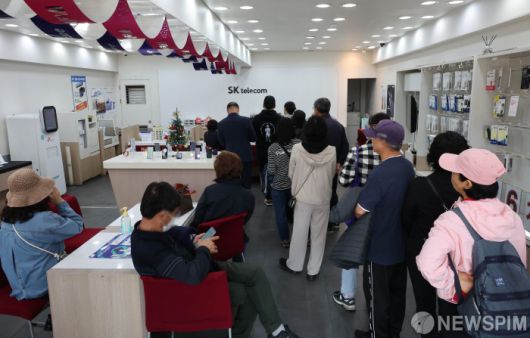[인천=뉴스핌] 김학선 기자 = 가입자 유심(USIM) 정보를 해킹 당한 SK텔레콤이 유심 무료교체 서비스를 시작한 28일 인천의 한 대리점에서 고객들이 유심을 교체하고 있다. SKT는 사이버침해 피해를 막기 위해 이날 오전 10시부터 전국 2600여곳의 T월드 매장에서 희망 고객 대상 유심 무료교체 서비스를 진행한다. 2025.04.28 yooksa@newspim.com |