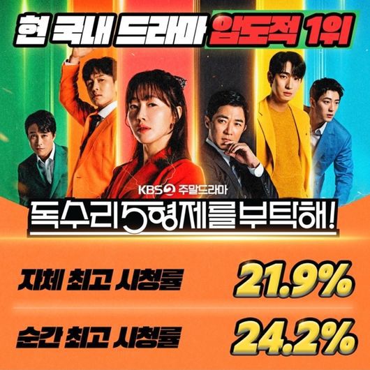 엄지원이 침체기에 빠졌던 KbS 주말극에 ’독수리 5형제를 부탁해’의 마광숙을 통해 K시청률 보증수표로 급부상 했다. 극 초반 16%로 시작했던 시청률은 최근 최고 시청률 21.9%와 순간 시청률 24%를 돌파하며 올해 KBS 드라마 최고 수치를 기록했고, 그 중심엔 단연 엄지원이 있었다.