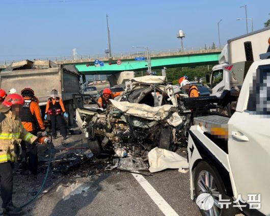 [시흥=뉴스핌] 오영균 기자 = 3일 오전 7시 23분쯤 경기 시흥시 대야동 대야교차로에서 신호대기 중이던 덤프트럭을 소형 SUV차량이 추돌하는 사고가 발생했다. [사진=송영훈 독자 제공] 2025.06.03 gyun507@newspim.com |
