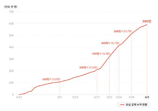 SK텔레콤 유심 교체 가입자는 지난달 5일 100만명을 넘어선 이후 17일 210만명, 21일 323만명, 24일 417만명, 28일 517만명을 기록하는 등 교체 속도가 빨리지고 있다. SK텔레콤은 이달에도 500만개 이상의 유심을 추가로 확보할 예정이다.
