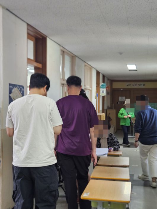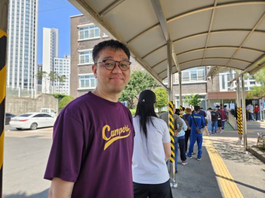 3일 인천 미추홀구 숭의초등학교 2학년 5반에 설치된 숭의제4동 3투표소. 사전투표로 미처 다 담아내지 못한 투표 열기는 초등학교 건물 앞에 길게 늘어선 대기줄로 증명되고 있었다. 오전 10시께 대기줄 인파에 합류한 윤중현 전국택배노동조합 수석부위원장은 투표를 앞두고 “투표를 하면서 울컥한 건 이번이 처음”이라며 벅찬 마음을 드러냈다.
