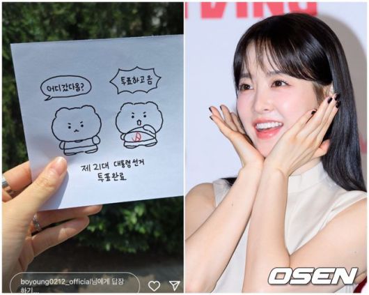 박보영은 3일 자신의 인스타그램스토리에 별다른 메시지 없이 사진 한 장을 올렸다. 사진에는 망그러진곰 캐릭터가 "어디 갔다 옴?", "투표하고 옴"이라는 대화를 나누고 있다. 이는 제21대 대통령선거 투표완료 인증사진이다.