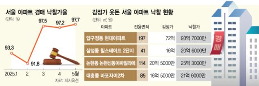3일 경·공매 데이터 전문기업 지지옥션에 따르면 지난달 서울 아파트는 총 252가구가 경매에 나와 이 가운데 114가구가 낙찰됐다. 감정가 대비 낙찰가 비율을 나타내는 낙찰가율은 97.7%로, 2022년 6월(110.0%) 이후 2년 11개월 만에 최고치를 기록했다.
