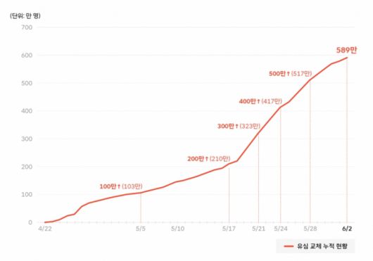 6월 3일 기준 SKT 유심 교체 누적 가입자 수를 나타낸 그래프/사진=SKT |