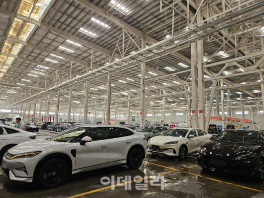 중국 산둥성 지난시의 BYD 공장에 완성된 전기차들이 출고 대기 중이다. (사진=이데일리 이명철 특파원) |