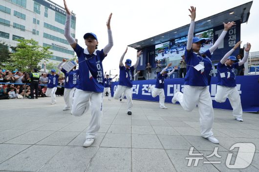 20일 오후 경기 파주시 금릉역 중앙광장에서 열리는 이재명 더불어민주당 대통령 후보 유세 현장에서 선거운동원들이 이 후보 지지를 호소하며 춤을 추고 있다. 2025.5.20/뉴스1 ⓒ News1 안은나 기자 |